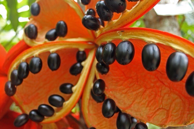 The Ackee fruit shown above is exactly how it should appear when it’s ready for use. Native to Jamaica, it is a delicacy in many Jamaican dishes. The image above depicts the fruit when it’s ripe. The seed is visible emerging from the white flesh, which is the only edible part of the fruit. The rest is highly toxic. Ackee is also used as a vegetable and is an integral part of the culinary scene in Jamaica.